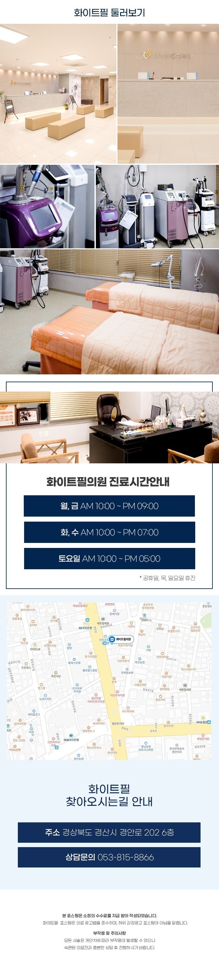 경산 보톡스 시술 후 적용부위를 자극하지 않아야 하며 사우나, 격한 운동, 음주, 흡연 등은 삼가해야 합니다. 여러 피부 고민은 개개인마다 다르고, 다양하기 때문에 하나의 방안보다는 개인마다 다른 피부 환경을 고려하는 것이 중요합니다. 이를 위해 시술 전 충분한 검사와 상담을 통해 확인한 후에 진행합니다.